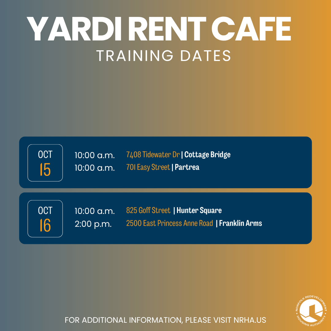 The Norfolk Redevelopment and Housing Authority (NRHA) invites residents to attend upcoming Yardi RentCafe training sessions this October. These sessions will help residents understand how to access and manage their rent accounts online through the Yardi RentCafe platform.